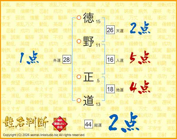 あなたの人生を表す1番重要な運勢です。生涯を通じて影響する総合運となり、主に50歳以降の晩年期に影響を及ぼします。苗字と名前の合計画数。