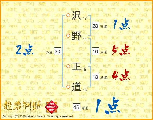生活面を象徴する運勢です。外部から受ける影響力を表し、結婚運、家庭運や職場、環境への順応性を表します。総運から人運を引いた画数。姓や名が1文字の場合を除く。
