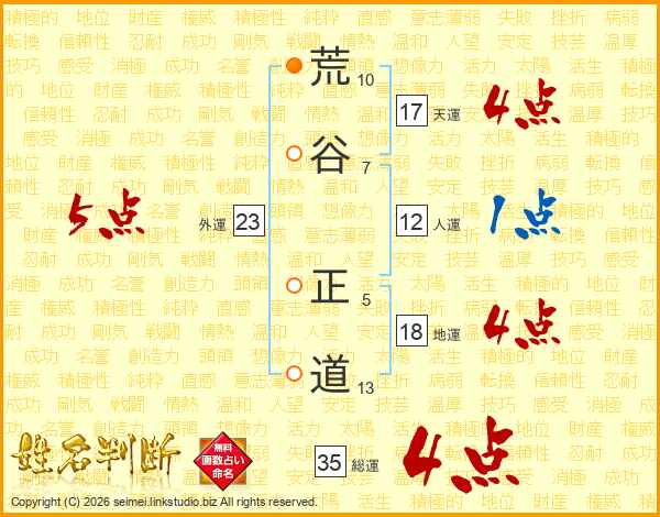 生活面を象徴する運勢です。外部から受ける影響力を表し、結婚運、家庭運や職場、環境への順応性を表します。総運から人運を引いた画数。姓や名が1文字の場合を除く。