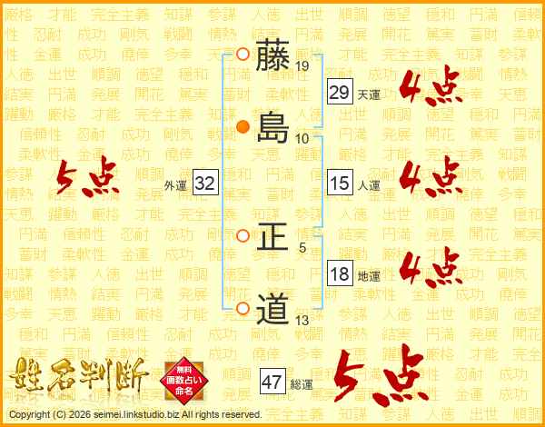 あなたの人生を表す1番重要な運勢です。生涯を通じて影響する総合運となり、主に50歳以降の晩年期に影響を及ぼします。苗字と名前の合計画数。