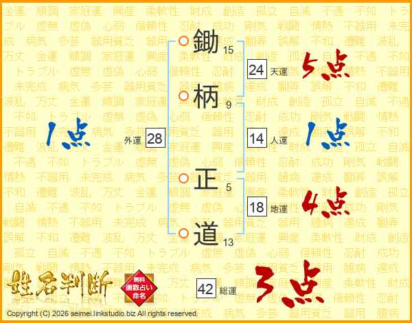 鋤(15画)柄(9画) 正(5画)道(13画)