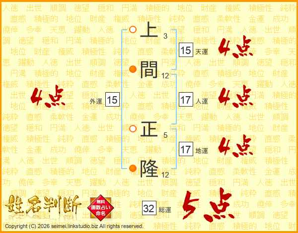 あなたの人生を表す1番重要な運勢です。生涯を通じて影響する総合運となり、主に50歳以降の晩年期に影響を及ぼします。苗字と名前の合計画数。