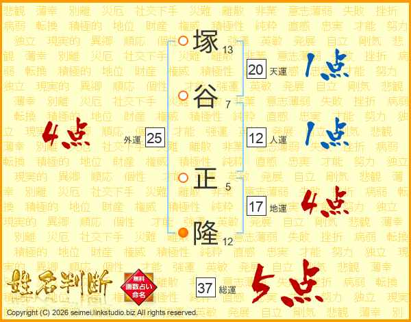 塚(13画)谷(7画) 正(5画)隆(12画)