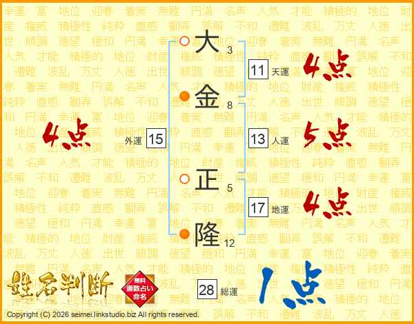 あなたの人生を表す1番重要な運勢です。生涯を通じて影響する総合運となり、主に50歳以降の晩年期に影響を及ぼします。苗字と名前の合計画数。
