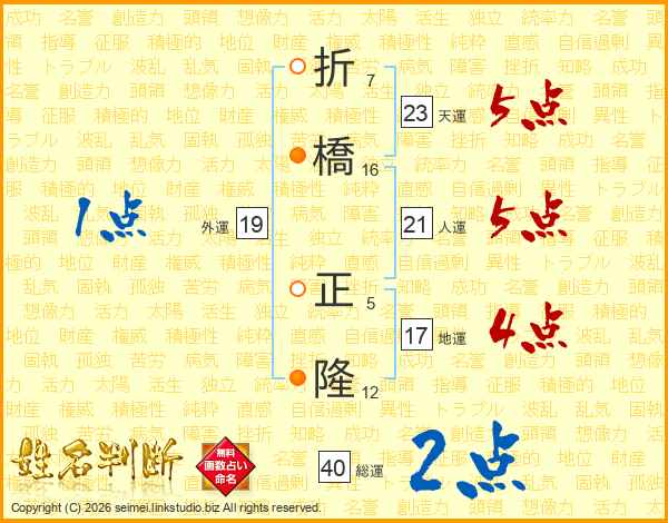 あなたの人生を表す1番重要な運勢です。生涯を通じて影響する総合運となり、主に50歳以降の晩年期に影響を及ぼします。苗字と名前の合計画数。