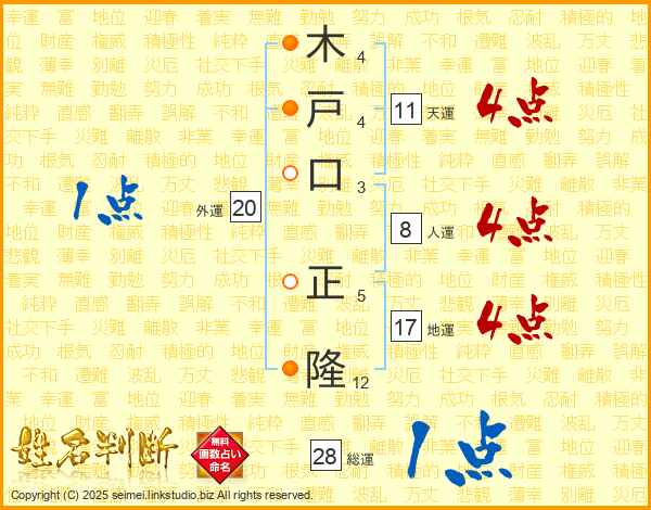 木(4画)戸(4画)口(3画) 正(5画)隆(12画)