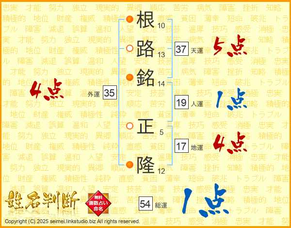 根(10画)路(13画)銘(14画) 正(5画)隆(12画)