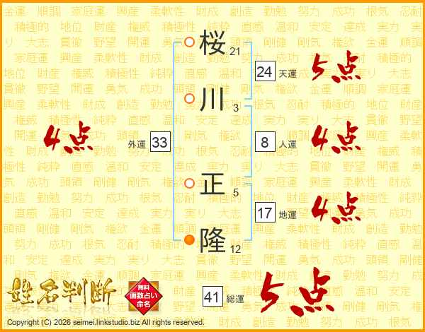 あなたの人生を表す1番重要な運勢です。生涯を通じて影響する総合運となり、主に50歳以降の晩年期に影響を及ぼします。苗字と名前の合計画数。