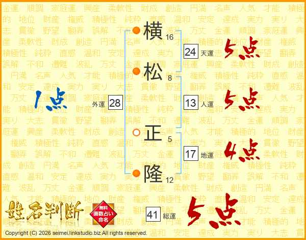 横(16画)松(8画) 正(5画)隆(12画)