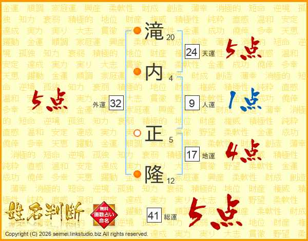 あなたの人生を表す1番重要な運勢です。生涯を通じて影響する総合運となり、主に50歳以降の晩年期に影響を及ぼします。苗字と名前の合計画数。