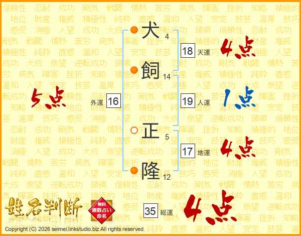 犬(4画)飼(14画) 正(5画)隆(12画)