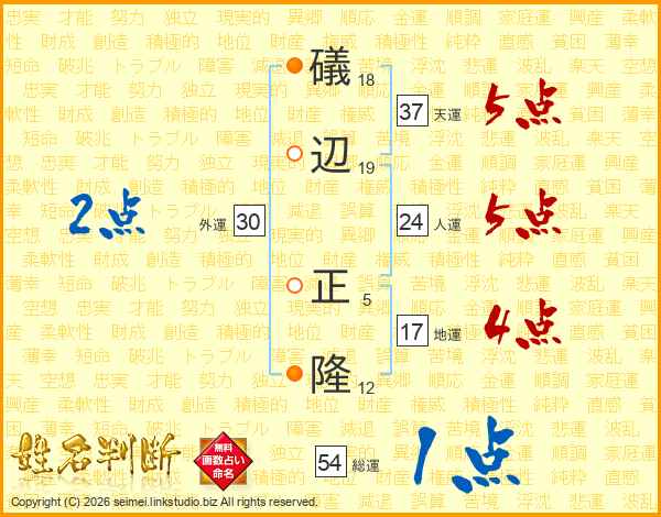 礒(18画)辺(19画) 正(5画)隆(12画)