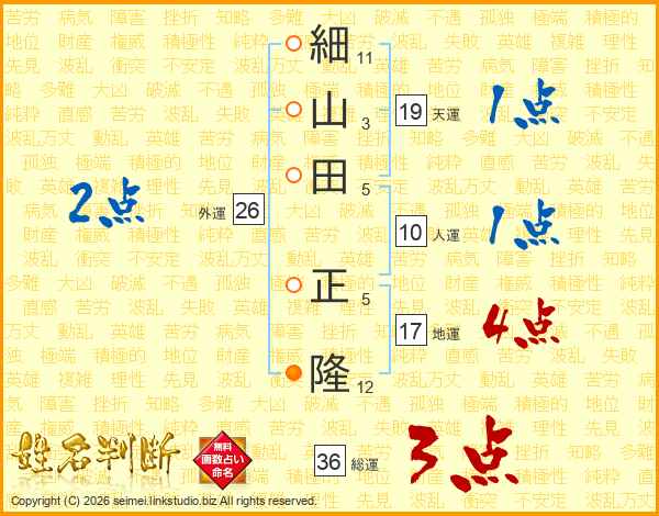 細(11画)山(3画)田(5画) 正(5画)隆(12画)