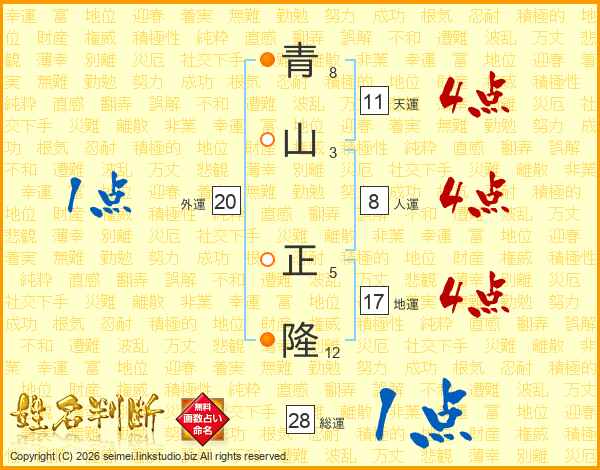 青(8画)山(3画) 正(5画)隆(12画)