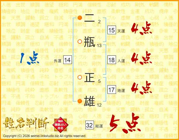あなたの人生を表す1番重要な運勢です。生涯を通じて影響する総合運となり、主に50歳以降の晩年期に影響を及ぼします。苗字と名前の合計画数。