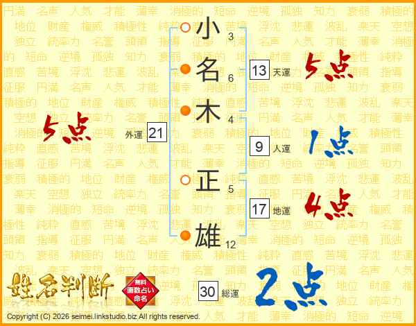 小(3画)名(6画)木(4画) 正(5画)雄(12画)