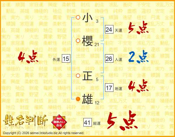 小(3画)櫻(21画) 正(5画)雄(12画)