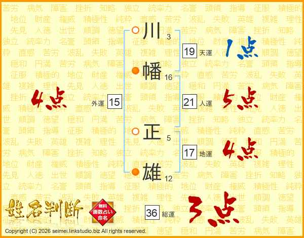 生活面を象徴する運勢です。外部から受ける影響力を表し、結婚運、家庭運や職場、環境への順応性を表します。総運から人運を引いた画数。姓や名が1文字の場合を除く。