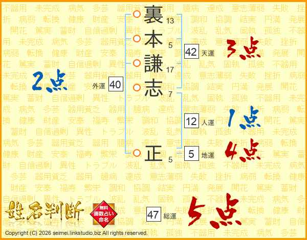 裏(13画)本(5画)謙(17画)志(7画) 正(5画)