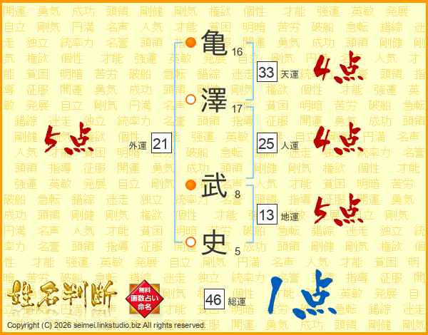 亀(16画)澤(17画) 武(8画)史(5画)