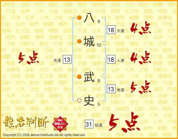 生活面を象徴する運勢です。外部から受ける影響力を表し、結婚運、家庭運や職場、環境への順応性を表します。総運から人運を引いた画数。姓や名が1文字の場合を除く。