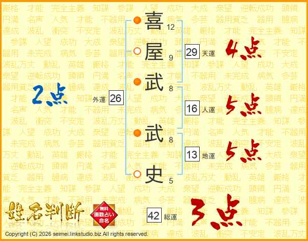 喜(12画)屋(9画)武(8画) 武(8画)史(5画)