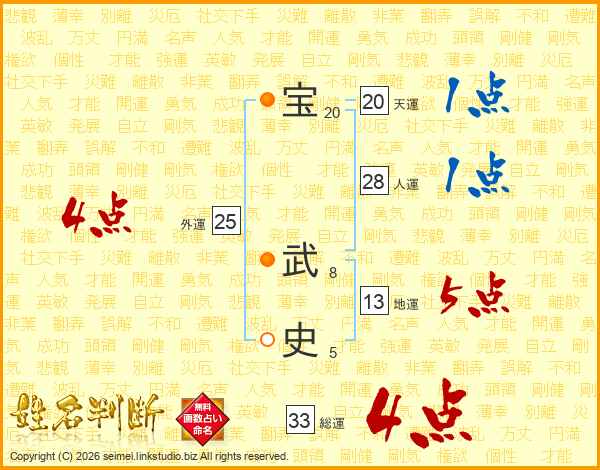 生活面を象徴する運勢です。外部から受ける影響力を表し、結婚運、家庭運や職場、環境への順応性を表します。総運から人運を引いた画数。姓や名が1文字の場合を除く。