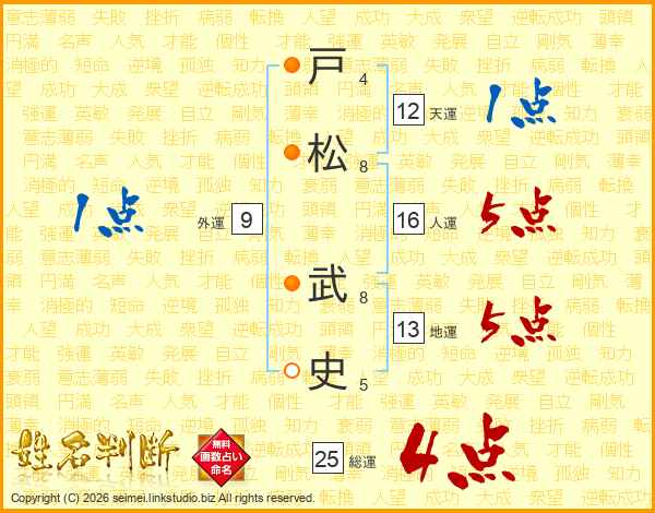 あなたの人生を表す1番重要な運勢です。生涯を通じて影響する総合運となり、主に50歳以降の晩年期に影響を及ぼします。苗字と名前の合計画数。