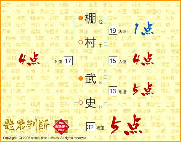 あなたの人生を表す1番重要な運勢です。生涯を通じて影響する総合運となり、主に50歳以降の晩年期に影響を及ぼします。苗字と名前の合計画数。