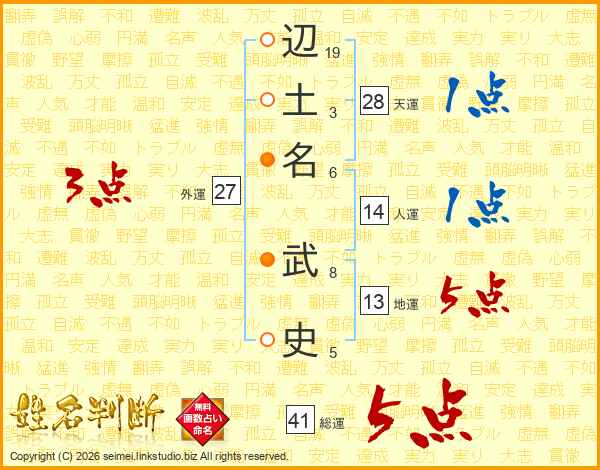 辺(19画)土(3画)名(6画) 武(8画)史(5画)