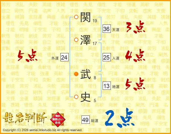 関(19画)澤(17画) 武(8画)史(5画)