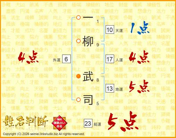一(1画)柳(9画) 武(8画)司(5画)