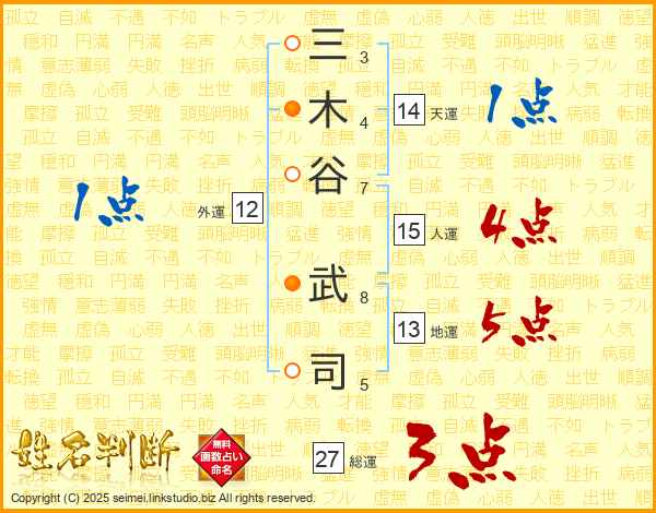 三(3画)木(4画)谷(7画) 武(8画)司(5画)