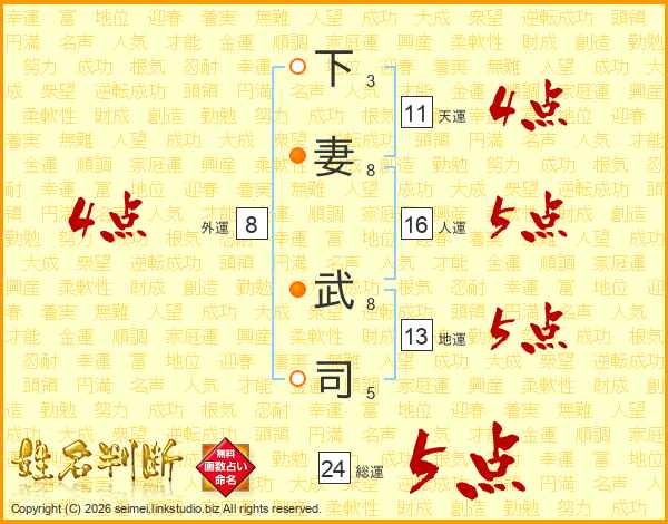 あなたの人生を表す1番重要な運勢です。生涯を通じて影響する総合運となり、主に50歳以降の晩年期に影響を及ぼします。苗字と名前の合計画数。