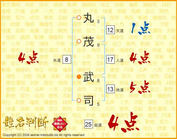 あなたの人生を表す1番重要な運勢です。生涯を通じて影響する総合運となり、主に50歳以降の晩年期に影響を及ぼします。苗字と名前の合計画数。