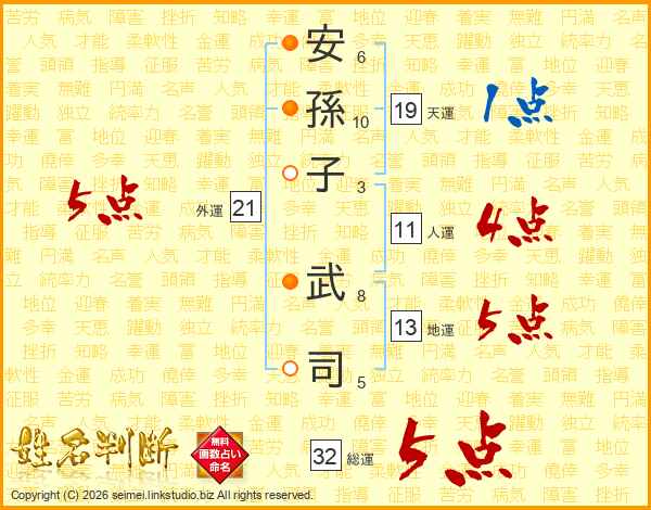 安(6画)孫(10画)子(3画) 武(8画)司(5画)