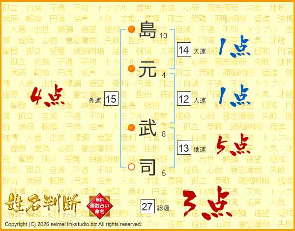 島(10画)元(4画) 武(8画)司(5画)