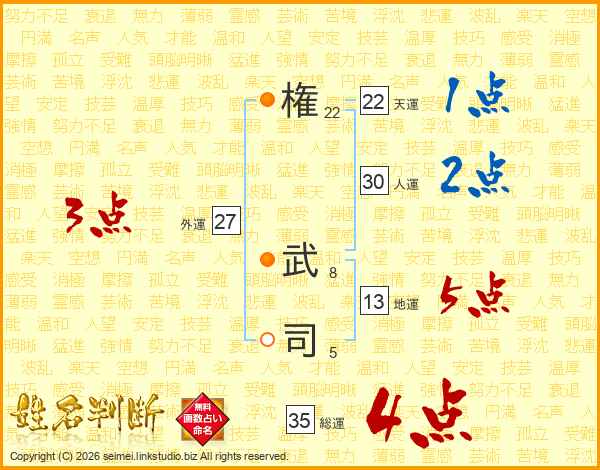権(22画) 武(8画)司(5画)