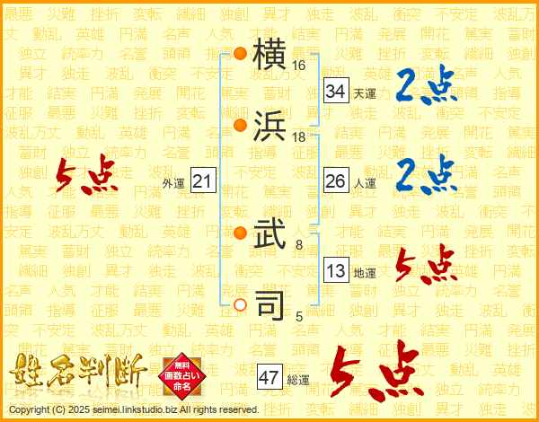 あなたの人生を表す1番重要な運勢です。生涯を通じて影響する総合運となり、主に50歳以降の晩年期に影響を及ぼします。苗字と名前の合計画数。