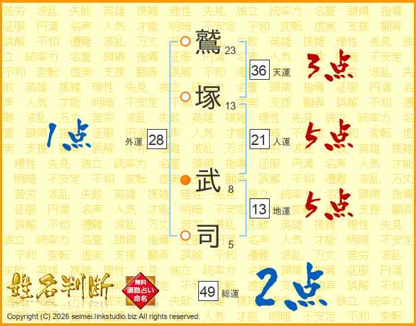 鷲(23画)塚(13画) 武(8画)司(5画)