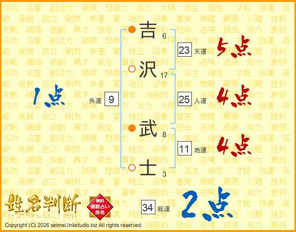 吉沢武士さんの総運は34画の2点!