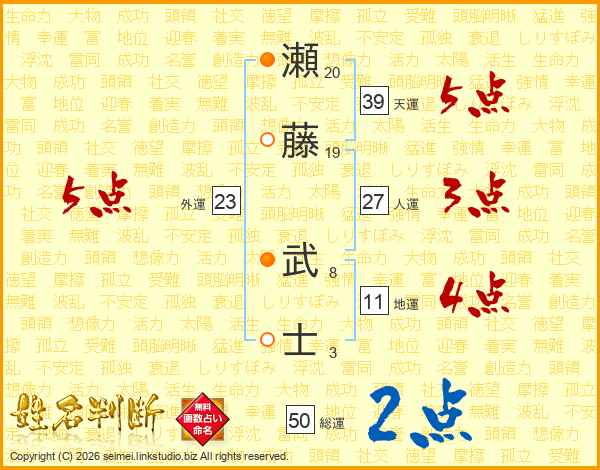 瀬藤武士さんの天運は39画の5点!