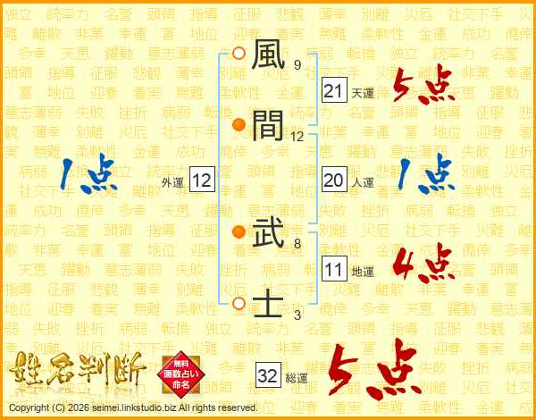 生活面を象徴する運勢です。外部から受ける影響力を表し、結婚運、家庭運や職場、環境への順応性を表します。総運から人運を引いた画数。姓や名が1文字の場合を除く。