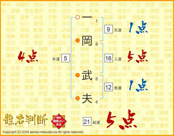 一岡武夫さんの総運は21画の5点!
