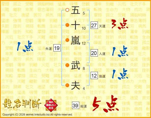 五(5画)十(10画)嵐(12画) 武(8画)夫(4画)