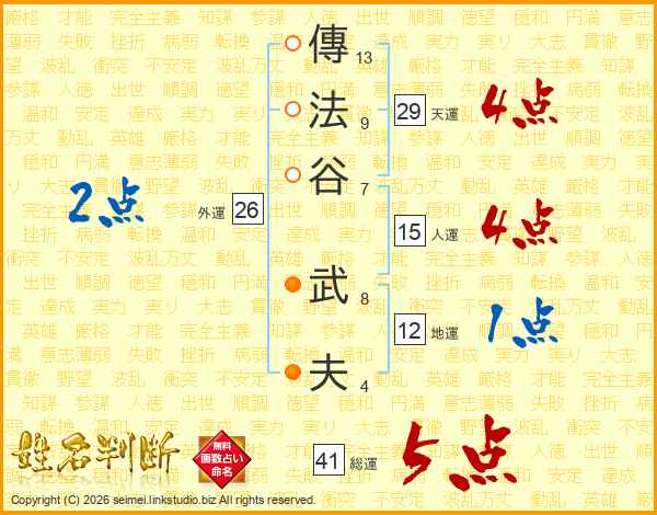 傳(13画)法(9画)谷(7画) 武(8画)夫(4画)