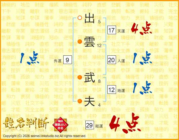 生活面を象徴する運勢です。外部から受ける影響力を表し、結婚運、家庭運や職場、環境への順応性を表します。総運から人運を引いた画数。姓や名が1文字の場合を除く。