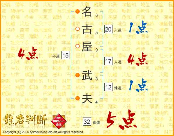 名(6画)古(5画)屋(9画) 武(8画)夫(4画)