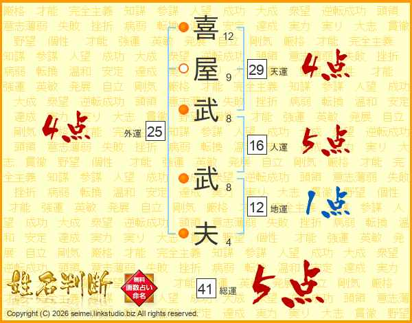 喜(12画)屋(9画)武(8画) 武(8画)夫(4画)