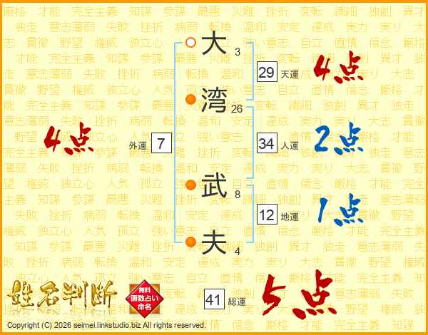 生活面を象徴する運勢です。外部から受ける影響力を表し、結婚運、家庭運や職場、環境への順応性を表します。総運から人運を引いた画数。姓や名が1文字の場合を除く。